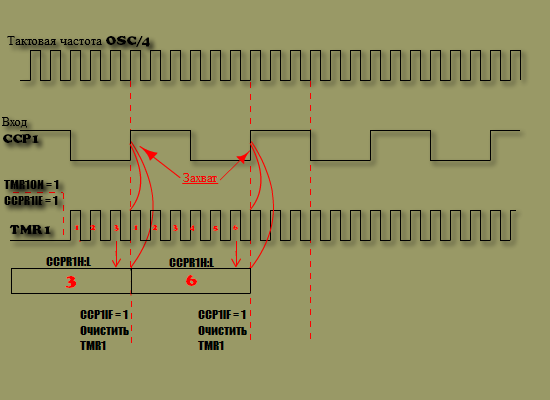 Не буду описывать все устройство, так как оно является частью коммерческой разработки. В общем, устройство разработано. Итак, режим захвата, модуль CCP. Мы будем рассматривать модуль CCP1, так как в устройствах с двумя модулями они работают одинаково, за исключением небольшого нюанса. Об этом вы можете прочитать в приложении от Microchip на русском языке, которое находится в прикрепленном архиве с проектом. Во-первых, модуль CCP представляет собой 8-разрядный регистр управления CCP1CON, 16-разрядный рабочий регистр, состоящий из двух 8-разрядных регистров CCPR1L и CCPR1H, и непосредственно вывод CCP1, который может быть как входом, так и выходом, в зависимости от режима работы модуля. В режиме захвата, этот вывод настраивается на вход. Также модуль, в зависимости от режима работы может взаимодействовать либо с таймером TMR1, либо с таймером TMR2. В режиме захвата модуль взаимодействует с таймером TMR1. Смысл работы режима захвата в том, чтобы захватить значение TMR1 в момент прихода импульса. Самый простой вариант измерения периода заключается в подсчете количества импульсов известной длительности между, умещающимися между двумя фронтами одного измеряемого периода. Подсчет заключается в фиксировании текущего значения TMR1 в момент прихода импульса на вход CCP1. Попытаюсь изобразить на рисунке, как работает этот модуль в режиме захвата.