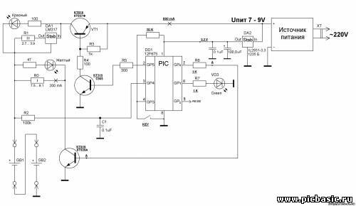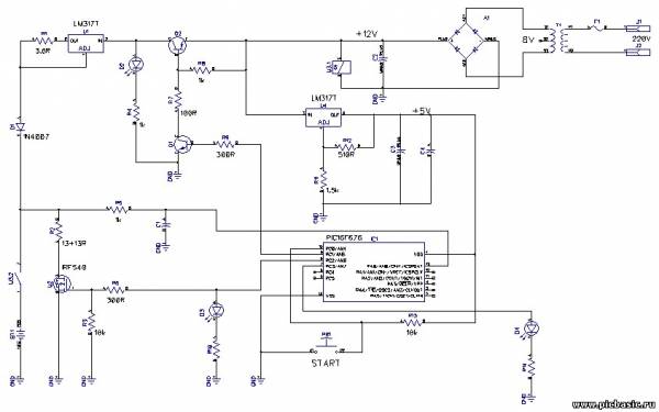 Принесли на ремонт ЗУ![]() Во время ремонта был получен отрицательный результат . ТО БП не запускался , то управление не работало . Было принято решение - сделать свое . После поисков в сети остановился на этом ![]() Повторив его , так и не понял логику его работы. Попробовал еще одну прошивку с сайта. Результат был такой же . Так как еще не работал с PIC12 , остановил свой взгляд на PIC16F676. Когда то купленым под другой проект С помощю Matrix252005 ( Николая ) PIC был сконфигурирован и я приступил к работе. Был выбран такой алгоритм работы: если поключен АКБ , напряжение двоих АКБ больше 1,2В и нажата кнопка Старт переходим в подпрограмму Разряда, а оттуда в зависимости от напряжения в подпрограмму Предзаряда или Заряда. При выбраном токе заряда время до окончания примерно 9 часов. В любом режиме контролируеться напряжение АКБ , если стало меньше 1,2В переход на Старт В результате была нарисована схема. Отличием от оригинальной схемы является только применение микроконтроллера. Изменить ток заряда можно, изменив номинал разистора R1 в ту или иную сторону . Обязательно также скорректировать и время заряда. На LM317T собран обычный стабилизатор тока. IRF540 ключ на разряд АКБ. Тоесть появилась 1 на затворе разряжаем АКБ. Реле добавлено для отключения АКБ при пропадании сети. Везде в программе, где указано напряжение имееться ввиду что это напряжение двоих аккамуляторов соедененных последовательно . Пользоваться ЗУ просто. Включили в сеть, подсоединили АКБ и нажали кнопку Старт. Если в любой момент вытащить АКБ, устройство вернется в начальное состояние. Схема: .Код: