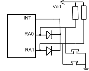 На счет схемы ADMINа: сначала бегло глянул и программый замысел понял сразу. Но! почитав сообщения terrarus и slavauk, решил привести некоторые пояснения и изменения. 1. Вывод INT-portB.0 настроен на прерывание по переходу с 1 в 0. Также необходимо либо включить внутренние резисторы подтяжки, либо подцепить внешний. 2. Сменить полярность диодов и убрать резисторы. Пока писал сообщение slavauk правильно заметил Quote Только у диодов кажется катод анод поменять местами нужно.